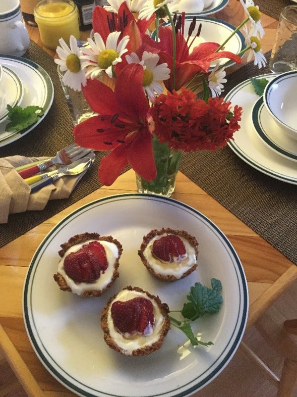 I assured him that if he remained patient he would come to see what made “this place” so special. He was lactose intolerant (I served no dairy other than optional yogurt) and not that into breakfast anyway (despite inquiring in advance about some of the details); she was bowled over by the scones and the muesli and the yogurt-filled oat cups topped with local strawberries.